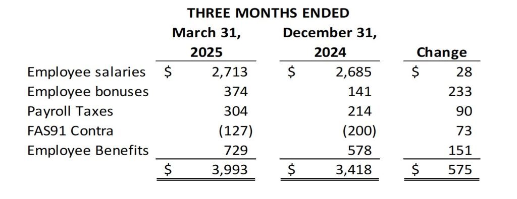 For the quarter ended March 31, 2025, noninterest expense totaled $6.7 million, representing an increase of $573 thousand from the quarter ended December 31, 2024. The largest expense fluctuation occurred in the salaries and employee benefits category, which grew $575 thousand from the prior quarter, accounting for all of the quarterly growth. Below is a summary of the quarterly salaries and benefits expense detail.