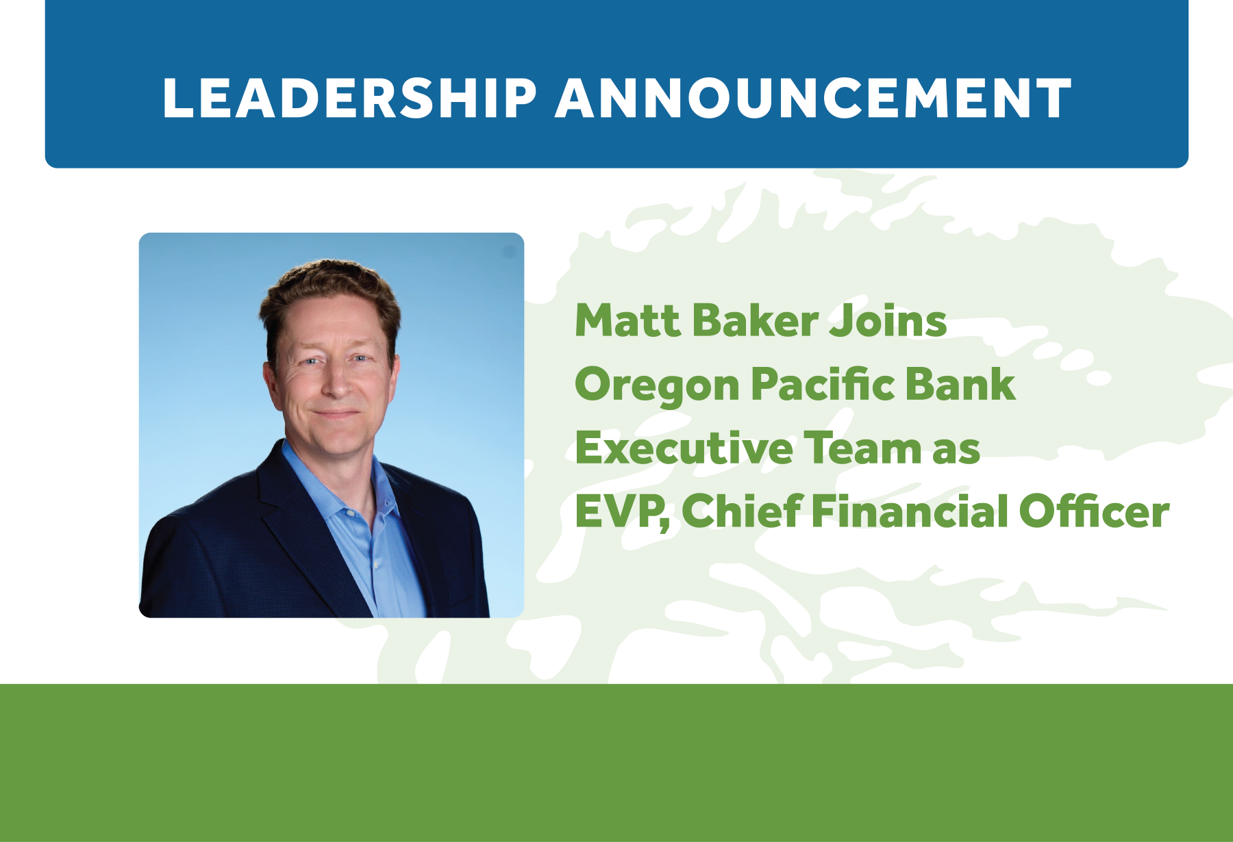 Oregon Pacific Bank today announced the appointment of Matt Baker as Executive Vice President and Chief Financial Officer. Matt joins the Bank as part of its planned executive leadership transition, following the previously announced promotion of Amber White to President and the Bank’s initiation of a CFO search as part of its CEO succession plan.