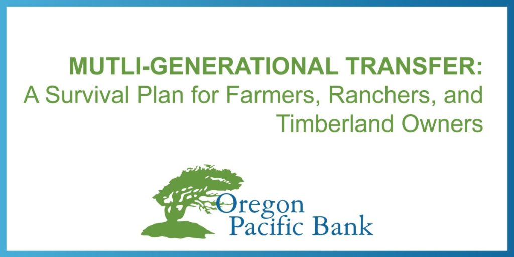 Farmers and ranchers lead a complex lifestyle and require specialized solutions. A team of advisors, including attorneys, accountants, and bankers can help you create and maintain a plan that will preserve your legacy, your lifestyle, and your way of life for your lifetime and for future generations. Please contact Oregon Pacific Bank if you would like to arrange for a consultation.